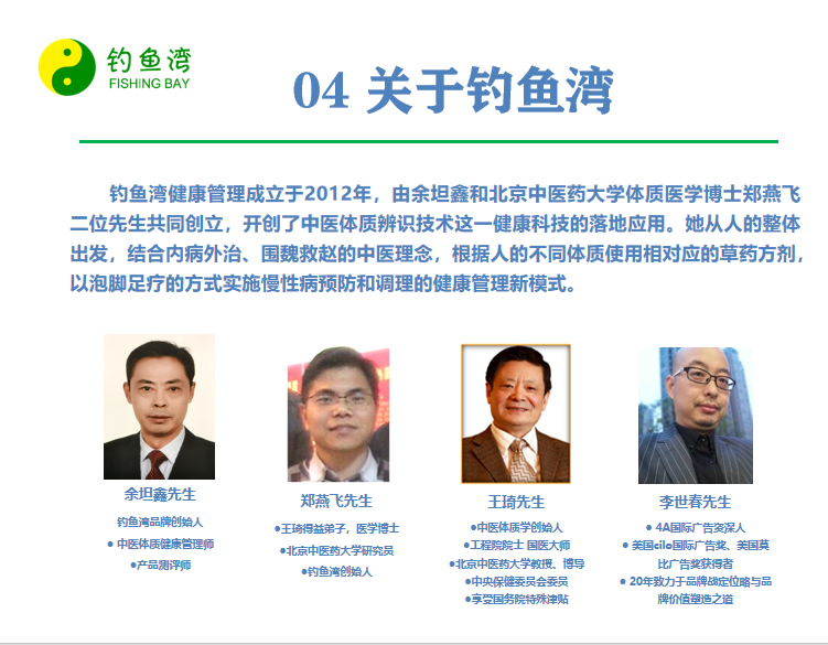 钓鱼湾(北京)生物科技有限公司,简称『钓鱼湾』,由余坦鑫和北京中医药大学郑燕飞博士于2012年12月在北京海淀注册成立。是一家专注中医体质辨识技术应用与推广的创新型生物科技企业,致力于通过“以体质这个整体为核心”的健康管理方案,服务中青年亚健康人群“未病先防”与老年慢病患者“既病防变”,推动中医药大健康产业发展。